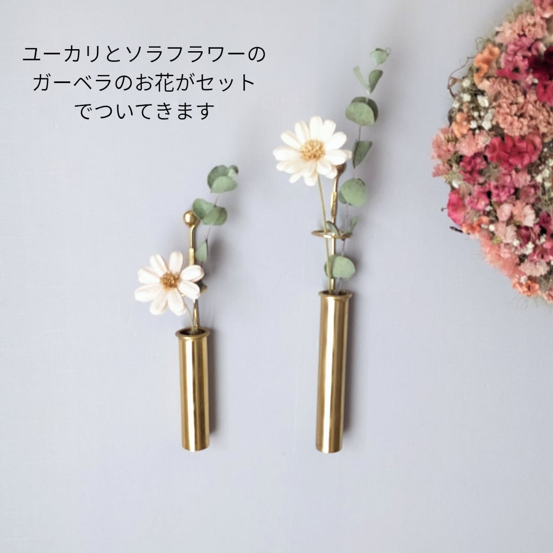 生花も飾れるゴールド仕上げのハンギングフラワーべース。ユーカリとソラフラワーのガーベラのお花セット付きです。